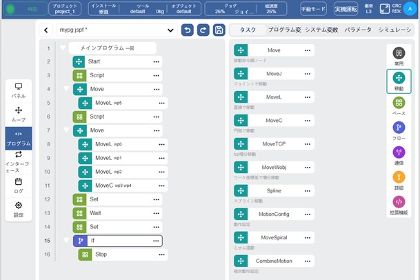- プログラムブロックや設定で入力する座標の単位は[mm, degree]であるがスクリプトで入力する単位は[m, rad]と若干分かりずらい。