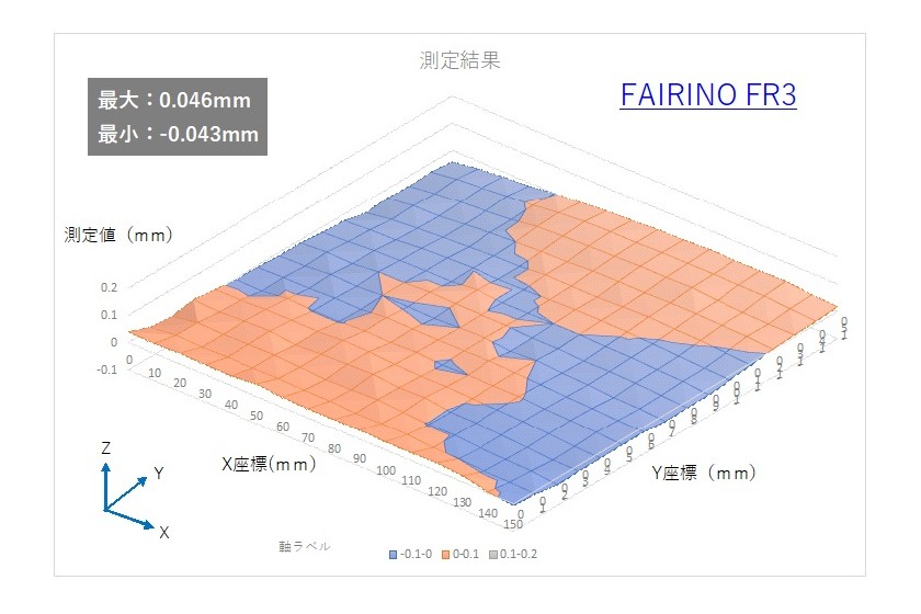 - 最大値は0.101mm、最小値は-0.086mm 幅 0.187mm。本数値はデジタルゲージの値であるので、ロボットの位置をしては指令値に対し、本数値をマイナスした位置にあると考えられる。