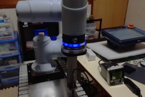 - 協働ロボットのエンドエフェクタにデジタルゲージを取り付け。