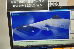- 今回の展示ではパターン投光レスで撮像するシステムを展示。本方式では透明ワークや鏡面のワークの点群取得が可能となった。